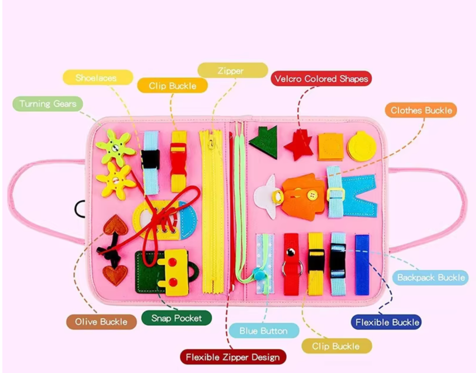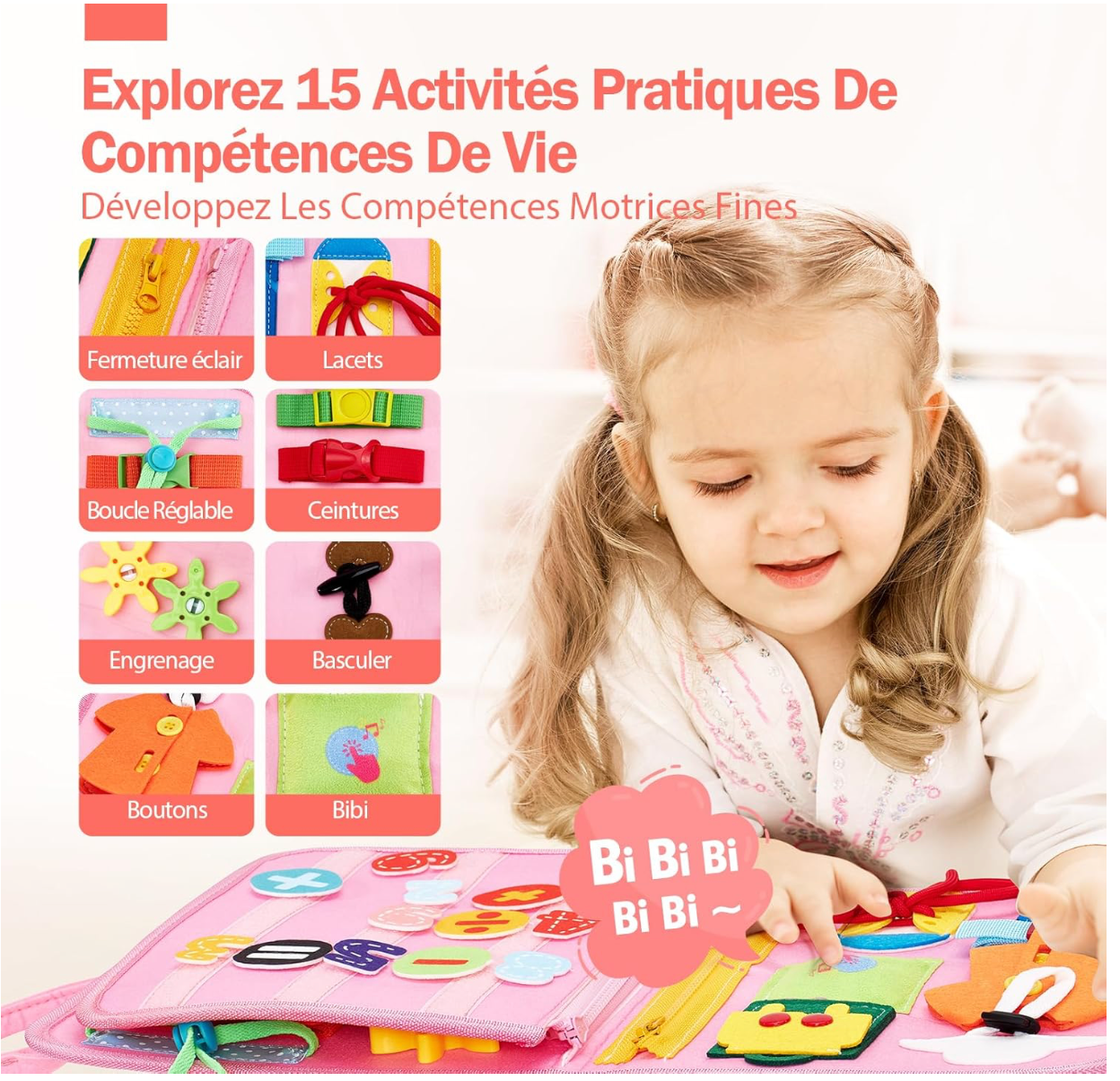 • Apprentissage par le jeu : Chaque page propose une activité sensorielle et pratique — boutonner, lacer, scratcher, découvrir les couleurs — pour développer la motricité fine et la coordination œil-main tout en s’amusant.